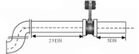 5、不同平面两个弯管的安装 如果流量计的前端有两个90°弯头,要保证流量计的前直管段≥25D,后直管段≥5D |